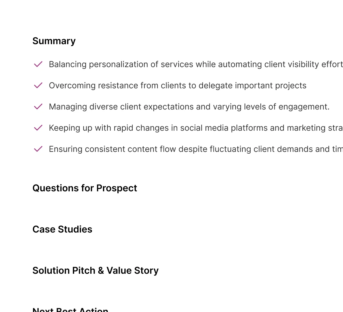 Tailored questions and talking points help guide conversations naturally to your solution.